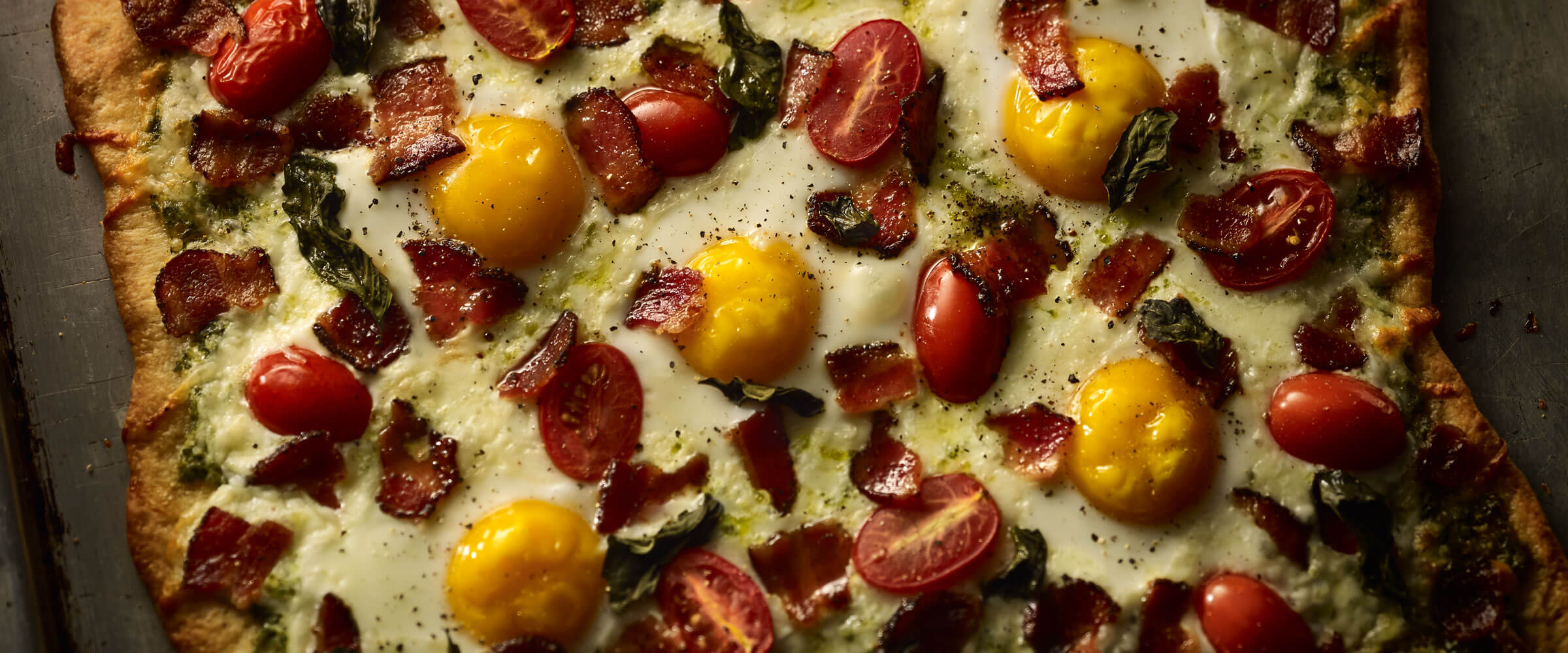 Spread pesto over crust. Sprinkle evenly with cheese. Crack eggs over pizza. Top with bacon and remaining ingredients.