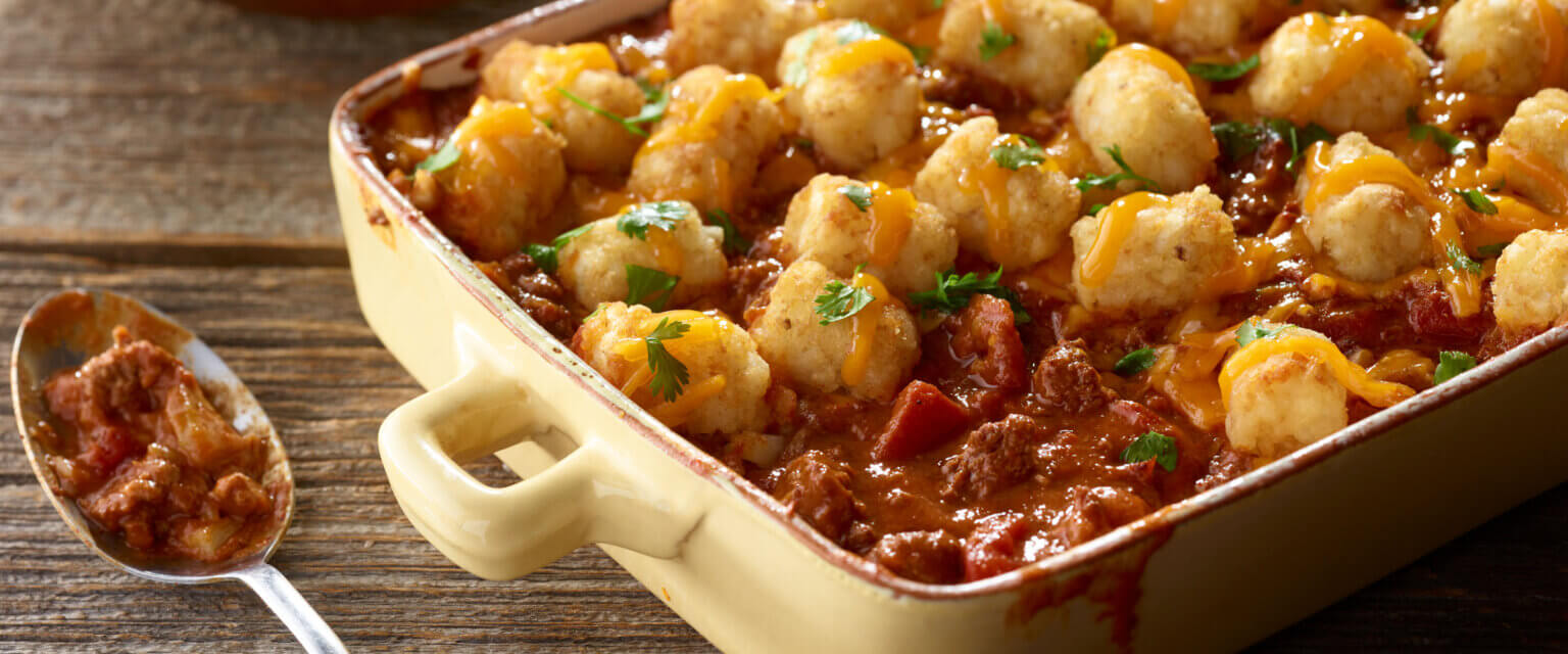 Create a cozy and flavorful Chili Potato Puffs Casserole for a hearty family dinner. Layer HORMEL® Chunky Chili No Beans, diced tomatoes, and diced green chiles with shredded cheddar cheese in a baking dish. Top generously with frozen potato puffs and bake until golden. Finish with a sprinkle of fresh cilantro and serve with dollops of sour cream for an extra touch of indulgence. This easy-to-make casserole is a comforting crowd-pleaser that will have everyone reaching for seconds.